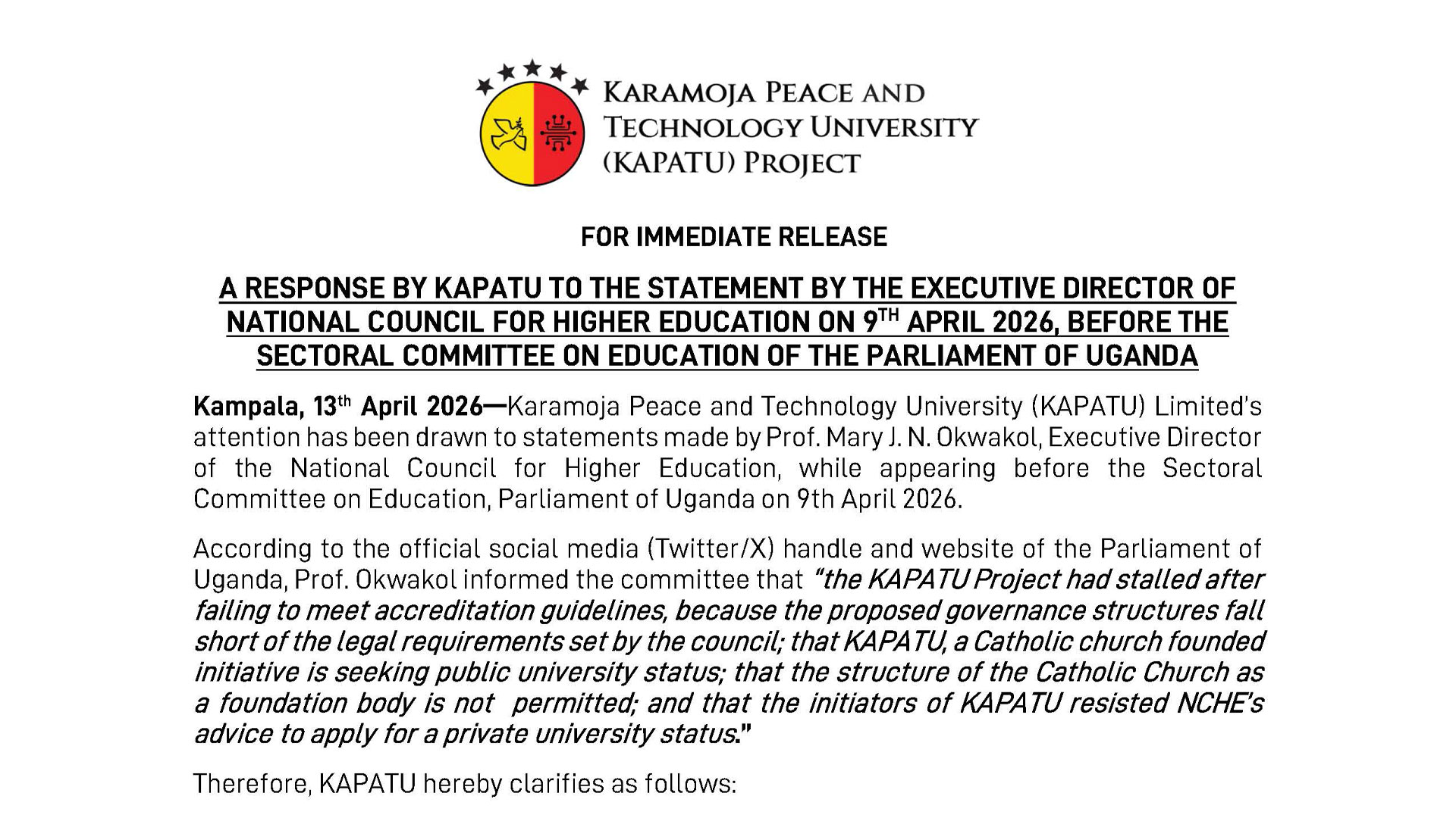 PRESS STATEMENT: Official Response to the Statement by the ED NCHE before the Sectoral Committee on Education of the Parliament of Uganda